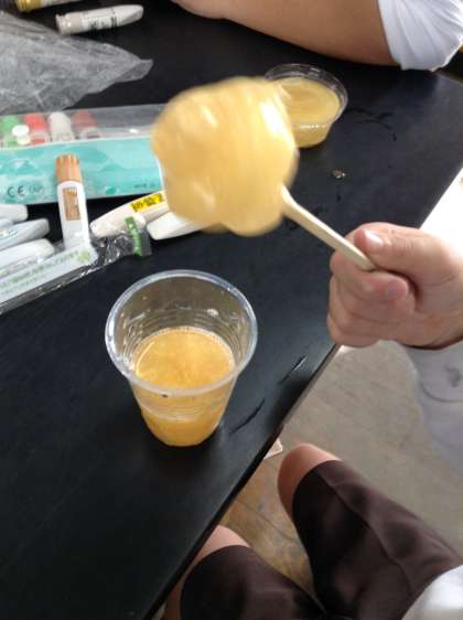 色はそれぞれで、水色や黄色やピンク色。とてもきれいでした。中には金色を混ぜ、出来上がりは“水あめ”のような児童もいました。
