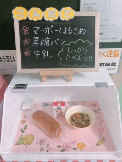 「マーボーはるさめ」は、牛ひき肉、豚ひき肉、はるさめを主材ににんじん、たけのこ等を使用し、トウバンジャンで少し辛味をきかせた味にしています。児童に好評な献立です。