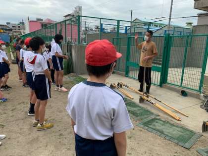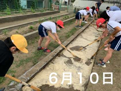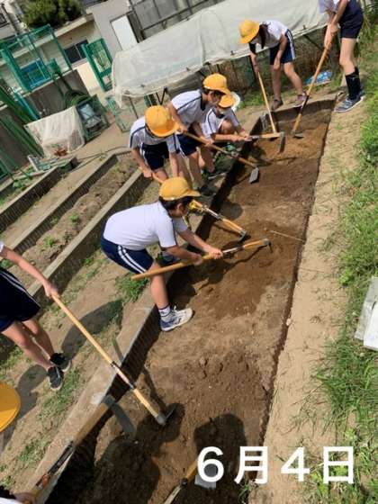 全員がしっかり担当の先生の話を聞き、くわを持って安全に一生懸命作業していました。