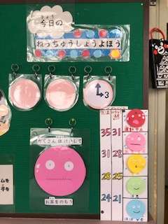 保健室の掲示板では、天気予報ならぬ今日の熱中症予報を掲示しています。児童の皆さん、ぜひチェックしてみてくださいね。