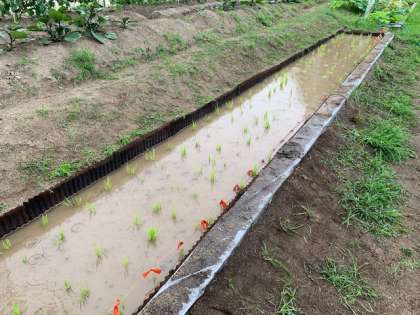 小雨が降っていましたが、グループごとに横一列に並びながら稲の苗を植えました。