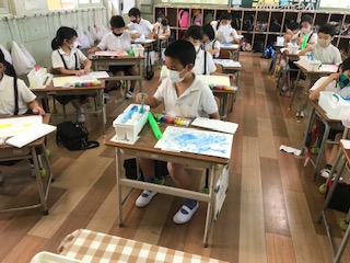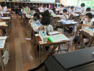 子どもたちが楽しみにして絵の具の使い方の学習をしました。絵の具できれいな色を出すためには、いろいろな約束事があります。水彩絵の具では、特に水の使い方(筆洗バケツの使い方)、筆の洗い方、パレットの使い方に約束事があります。その約束事をていねいに楽しく指導していきたいと考えています。