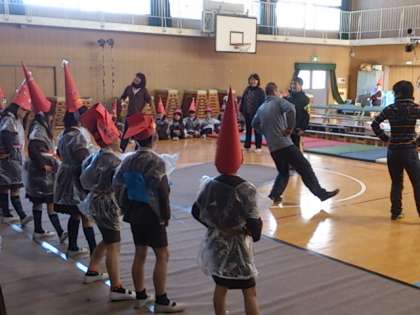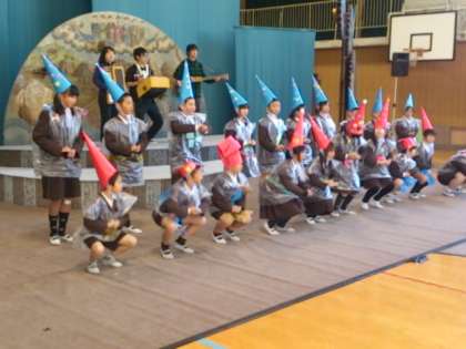 本日行われる演劇鑑賞会のリハーサルが始まりました。出演する4年生も劇団の人たちと一緒に舞台に立って、最後の練習をしています。