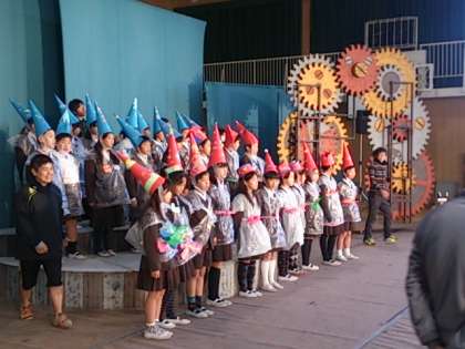 講堂に用意された本格的なセットを見てびっくり!緊張とワクワク感が入り混じった表情の子どもたちですが、本番に向けてみんなはりきっています。