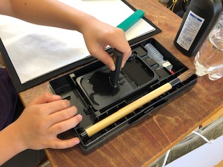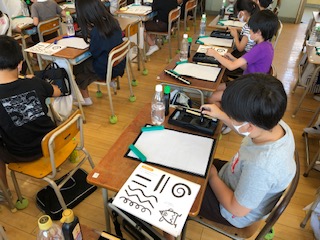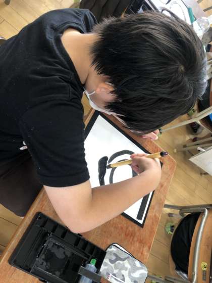 習字道具の名前や使い方を学習したあと、心を落ち着けて炭をすりその墨液を使い線や丸絵をかきました。