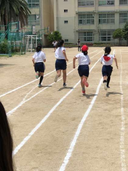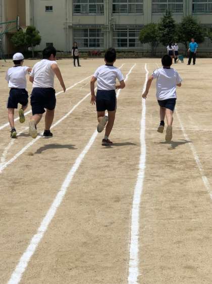 今までに40m走をし、その後50m走をしました。加速することが大事だと、練習を重ねて、今日タイムをはかりました。スタートからゴールまで、帽子がふきとぶほど全力で走り切った子どもたちは、満足そうでした。