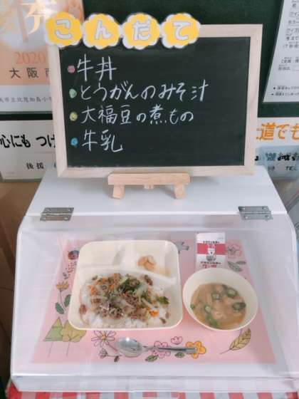 「牛丼」は、児童に人気の献立で、牛肉、糸こんにゃく、たまねぎ、にんじん、青ねぎ、えのきたけを甘辛く味付けし、煮ています。斜め切りの青ねぎの彩りを添えています。