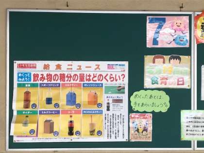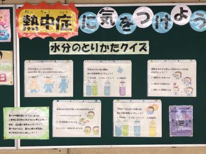 7月は「熱中症に気をつけよう」ということで、水分のとりかたについてのクイズを掲示しています。暑い日々が続いていますので、水分をこまめにしっかりとることが大切です。