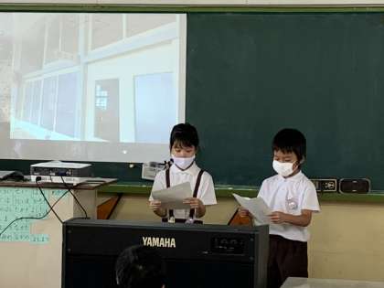 例年は、手をつないで実際に学校を回りますが、今年度は新型コロナ予防のため、プロジェクターを使っての紹介です。