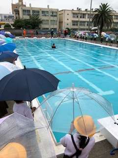 今日は雨の中、大正消防署の消防隊員のみなさまに来ていただき、水の中の救助活動の訓練の様子を見せていただきました。