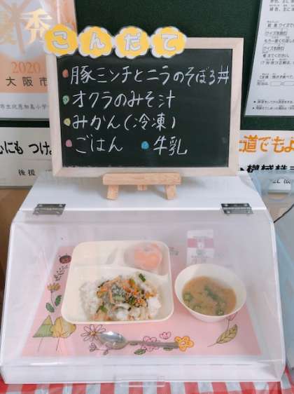 令和元年度学校給食献立コンクール最優秀賞に選ばれた献立です。中学生が考えました。献立のねらいは、「疲労回復と夏バテ防止をメインとして、ビタミンB1を多く含む豚肉と、その働きを促進し、糖質を素早くエネルギーに変えるにら、にんにく、たまねぎを一緒に調理しました。また、オクラのみそ汁で整腸作用、さらにみかんのクエン酸効果によるさっぱり感と疲労回復、夏バテ防止を考えました。」です。