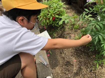 本日は、学習園に植えてある「マリーゴールド」「ホウセンカ」「オクラ」の成長を観察に行きました。