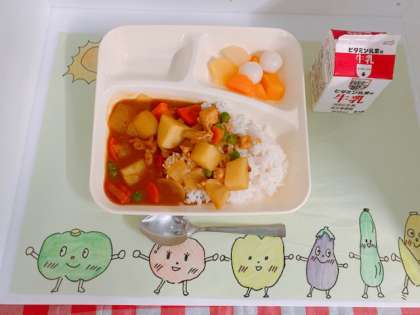 「チキンカレーライス」は、毎回児童に好評な献立です。鶏肉を主材に、みじん切りのにんにくとりんごピューレで旨みを増しています。