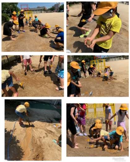 生活科の学習「なつのあそび」で、どろんこ遊びをしました。「ぷにぷにの土、触ってみてもいい・・・?」と恐る恐る遊び始める子どもたちでしたが、あっという間にあそびスイッチオン!!