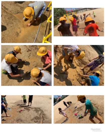 川を作ってつなげてみたり、きれいなどろだんごの作り方を研究したり・・・。それぞれが夢中になり、どろあそびをしていました。来週の木曜日は、いろいろな道具を使って水遊びをする予定です。