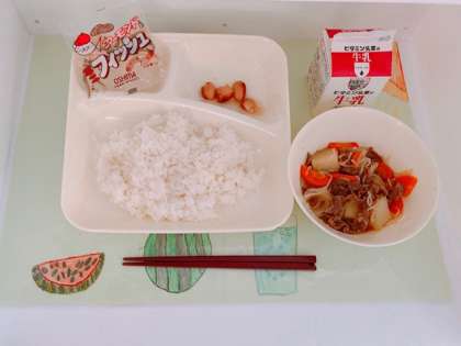 「肉じゃが」は、牛肉を主材に、じゃがいも、糸こんにゃく、たまねぎ、にんじんを使った児童に好評な煮ものです。
