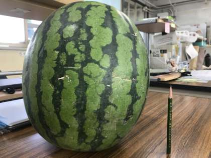 北恩加島小学校の学習園で、こんなに立派なスイカが育ちました!スイカの横のえんぴつと大きさを見比べてみてください。スイカを見ると夏を感じますね。