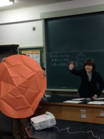 地球と太陽や月をイメージしやすくするようなお話をたくさんしていただきました。「地球を直径1cmの玉だとすると、太陽の大きさはどれくらいになるだろう?」 答えは、110cmでした。他にも、「地球を歩いて1周するとどれくらいかかるか?」など、とても楽しい授業でした。