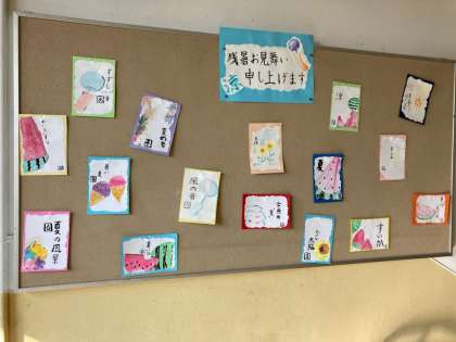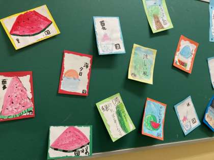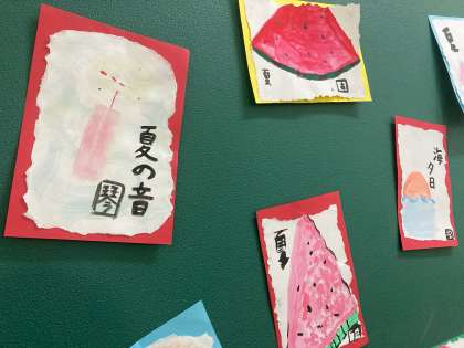 風鈴やスイカ、かき氷やひまわりの花など、「夏」ものをはがきくらいの大きさの画用紙に絵の具を使って描きました。