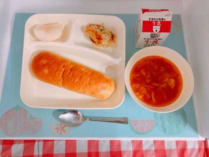 「トマトスープ」は、鶏肉を主材に、缶詰のトマトを使用したスープです。オリーブ油でにんにく、セロリをいためることで風味を増しています。