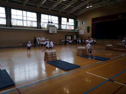 3段横→3段縦→4段横→4段縦→大きいとび箱4段横→4段縦と、段階を追って練習しています。