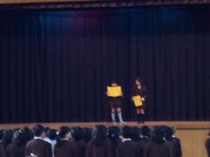 校長先生のお話、3年生による作文発表、生活指導のお話、校歌斉唱が行われました。