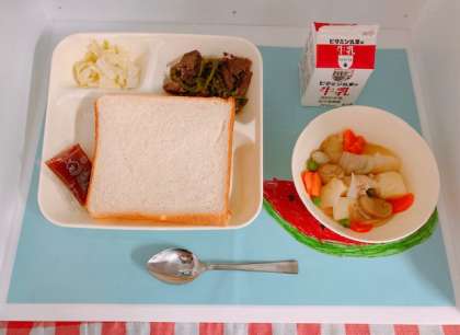 「スープ煮」は、鶏肉、じゃがいも、たまねぎ、にんじん、グリンピース、マッシュルームを使用した洋風の煮ものです。