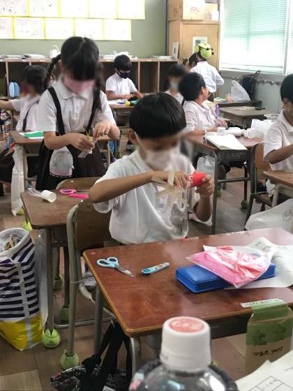 廃材を見て、「これはカメの甲羅に使えそう!」「これは、イソギンチャクの土台にしよう!」とイメージをふくらませていました。