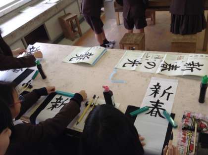 “楽しく過ごせますように。”と祈りを込め、『新春の光』を書きました。いつもと違う長い半紙に子どもたちは悪戦苦闘しました。