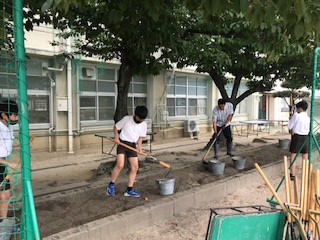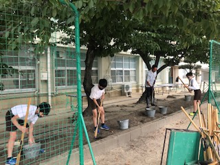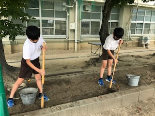 環境委員会の児童が、いちごを植えるための準備をしています。