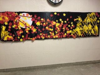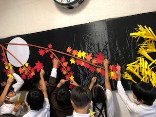それぞれにつくった紅葉やすすきが、大きなひとつの作品に変わっていく様子にとても喜んでいました。みんなの力が合わさるとすばらしい作品に仕上がることを感じることができました。