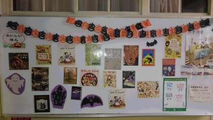 おいしいものがたくさんある秋、食べ物がおいしく感じる秋。北恩加島小学校図書館の前には、おいしい食べ物が登場する本やハロウィンにちなんだ魔女・魔法の本を紹介しています。ぜひ手にとり、読書の秋を楽しみましょう。