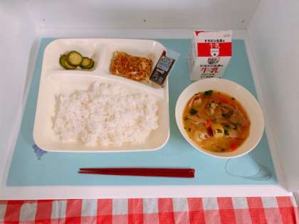 「お好み焼き」は、大阪の食文化を紹介する献立です。鶏卵、水、やまいもとろろ、小麦粉、塩で作った生地に、かつおぶし、あおのりを混ぜ、キャベツ、青ねぎを加えて焼き物機で焼きます。小袋のトンカツソースをかけて食べます。