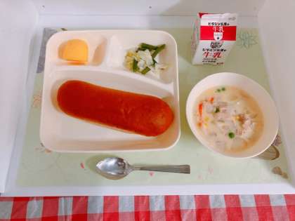 「コーンクリームシチュー〔米粉〕」は、小麦アレルギーの児童も食べることができるように、小麦粉を使った手作りルウの代わりに水ときの上新粉でとろみをつけます。スイートコーン(クリーム缶)、コーンの他に、にんじん、グリンピース、彩りよく仕上げています。