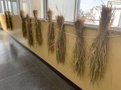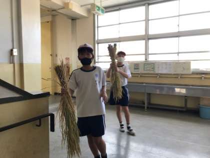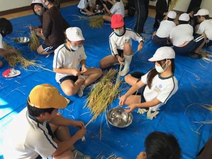 5年生が育てて、刈り取った稲がすっかり乾燥しましたので、脱穀(だっこく)と籾摺り(もみすり)を行いました。脱穀は割り箸をつかってお米をはじき、ボウルの中へ集めました。籾摺りはソフトボールをすり鉢に押し付けてゴリゴリとこすりました。すると見たことのある「お米」が出現!予想以上にたいへんな作業でしたが、どの子も初めての体験に歓声を上げていました。