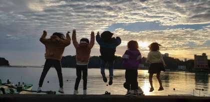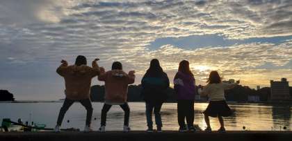 朝日を背景に写真撮影中です!