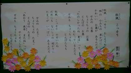 北恩加島小学校図書館では、毎月季節の詩を掲示しています。現在は、「秋風こっそり」(宮沢章二)紹介しています。