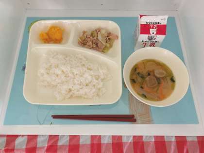 「つみれ汁」は、しょうが汁、料理酒で下味をつけたいわしだんごとだいこん、ごぼう、にんじん、青みにみつばを使用しています。