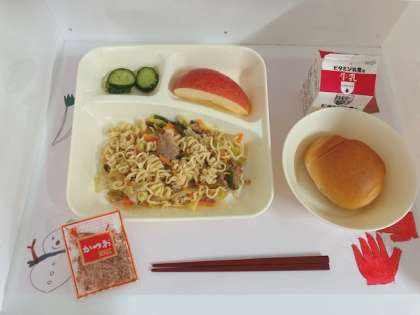 「和風焼きそば」は、豚肉を主材に、塩、こしょう、うすくちしょうゆ、こいくちしょうゆで味付けした焼きそばです。喫食時にかつおぶしをかけていただきます。
