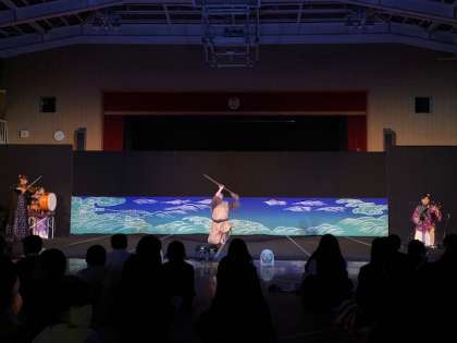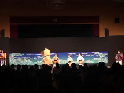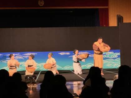 漁に出るサンラーと無事を祈るカナーとふたりの仲を応援する村娘たちが登場しました。言葉に頼らずに、沖縄の歌や踊りで、命のすばらしさを伝える舞台でした。