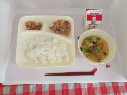 「すまし汁」は、鶏肉、はくさい、たまねぎ、にんじん、えのきたけ、青みにみつばを使用しています。