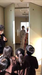 社会科「消防」学校の防火設備の学習の一環で、実際の消防設備点検の様子を見学させていただきました。