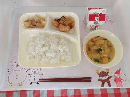 「みそ汁」は、うすあげ、はくさい、にんじん、しめじを使用し、青みに青ねぎを入れます。