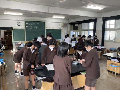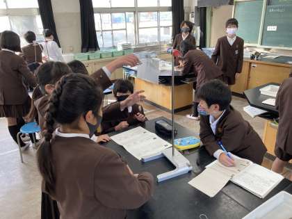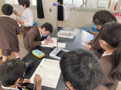 5年生は理科の学習で「ふりこのきまり」の実験を行いました。ふりこが1往復する時間がどんな条件で変わるのかをグループで協力して実験し、結果を記録していました。