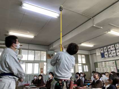 前回に引き続き、今回も消防設備点検です。今回は教室の中に設置されてある火災報知器について教えていただきました。