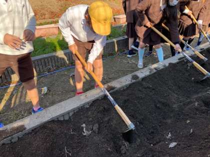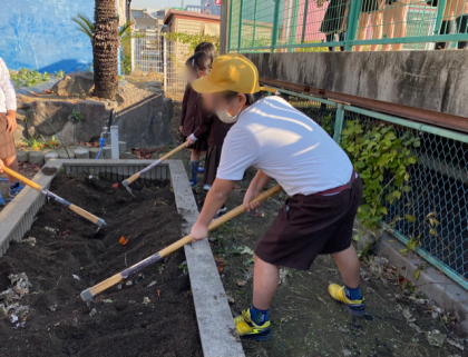4年全員で、ヘチマを植えていたところを片付けました。その後、来年のために土を耕し、肥料を混ぜました。来年もきっとたくさんの植物が育つはずです!