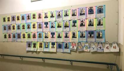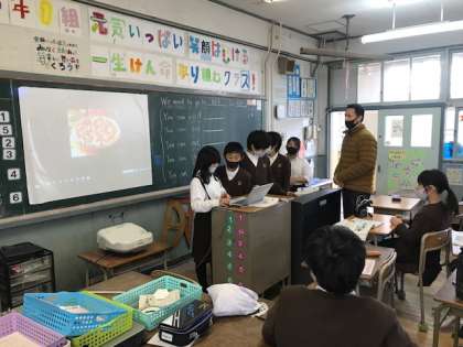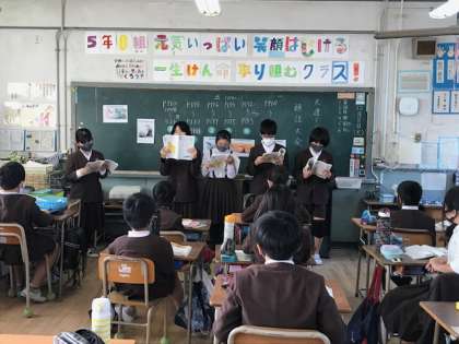 2学期もいよいよ終盤。各教科の学習もまとめの段階です。国語科では「大造じいさんんとがん」の朗読大会、外国語では「行きたい国の紹介」、家庭科ではミシンで制作したエプロンを着て写真を撮りました。エプロンの写真については2〜3階の階段踊り場に掲示してあります。明日からの個人懇談会の折にぜひご覧ください。