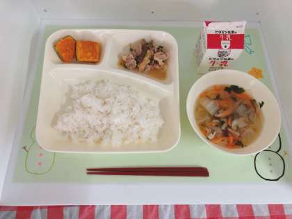「豚肉と干しずいきのみそ煮」は、豚肉、干しずいき、うすあげ、青ねぎを使用し、砂糖、みりん、こいくちしょうゆ、赤みそで味つけした煮ものです。干しずいきは、里芋の葉柄のことで、カルシウムや鉄、食物繊維が多く含まれます。昔から食べられてきた乾物のひとつとして、児童に伝えていきたい食材です。