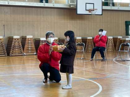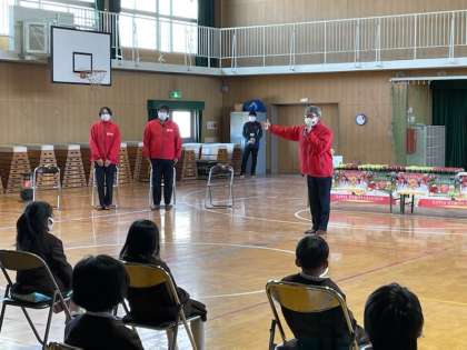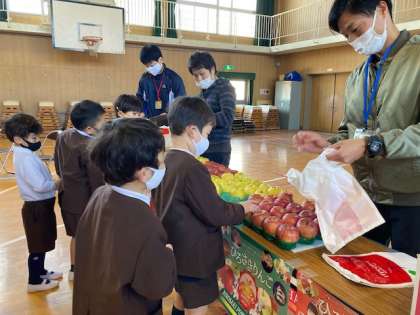 昨年度は、全校児童対象にりんごの出前授業に来てくださいました。今年度は、新型コロナウイルス感染拡大防止のため、少人数・短時間での実施となりました。出前授業(贈呈式)は、1年生のみでしたが、全校児童分のりんごをプレゼントしていただきました。