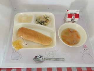 「スープ」は、ウインナーを主材に、旬のだいこんの他、じゃがいも、にんじん、青みにむきえだまめを使用しています。